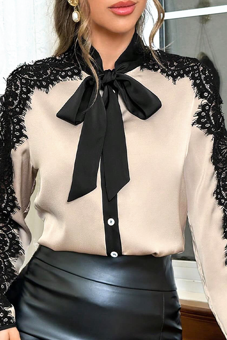 - Моделът е с дълги ръкави, класическа кройка, яка, копчета, черни детайли и панделка.