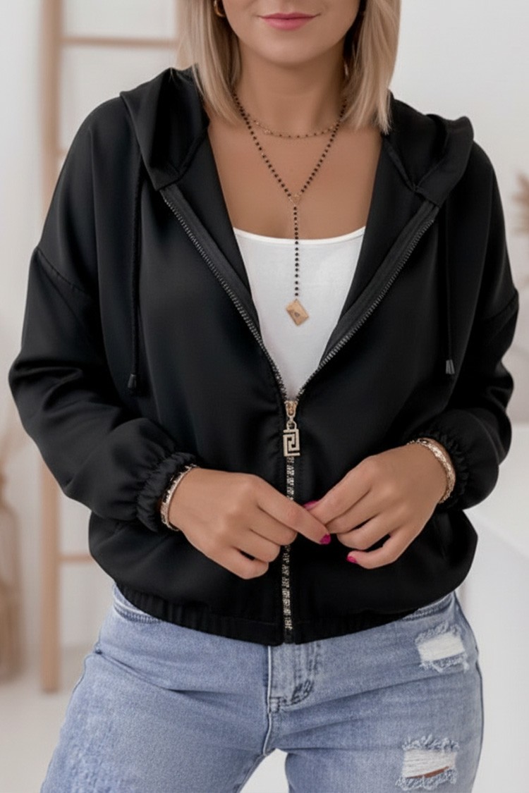 - Моделът е с класическа кройка, странични джобове, качулка и се закопчава чрез цип по цялата дължина.