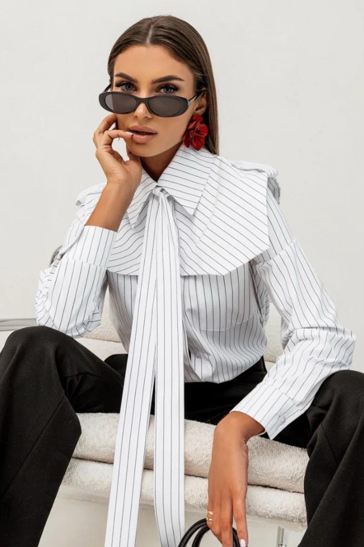 - Моделът е с дълги ръкави, ефектен десен райе и вратовръзка.