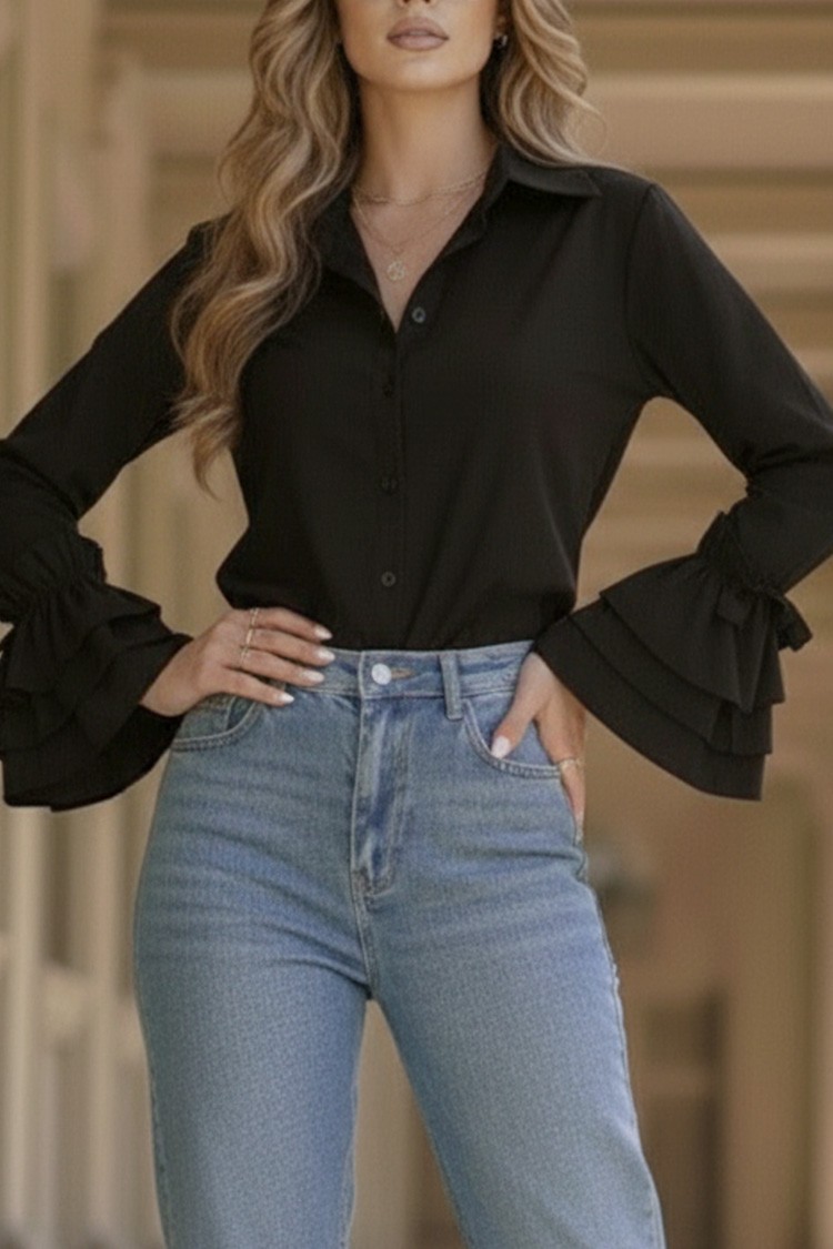 • Моделът е с кокетен дизайн, копчета поп цялата дължина и дълги ръкави с ефектни волани.