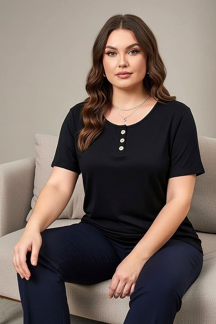 - Отлично пасва на всяка фигура. Моделът е с къси ръкави, копчета и класическо деколте.