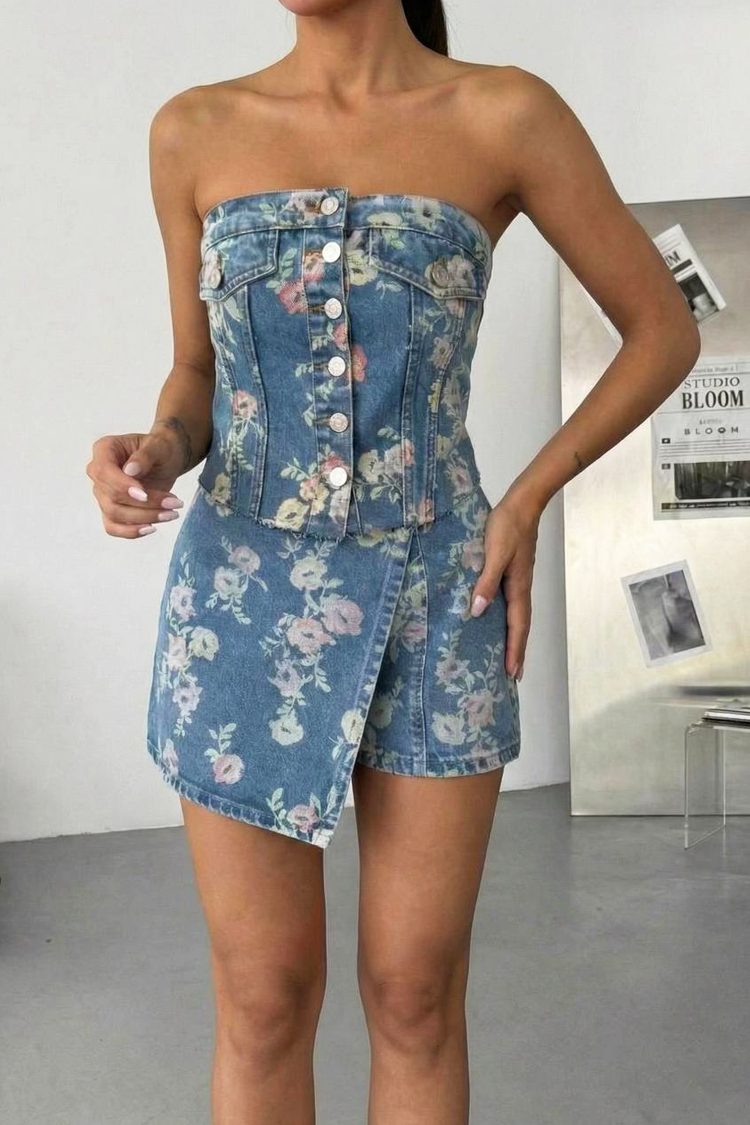- Елегантен комплект от две части: бюстие и пола - панталон в ефектен флорален десен.