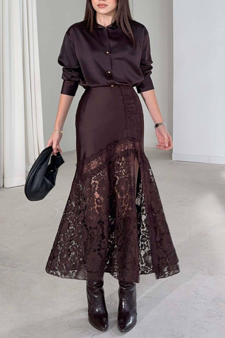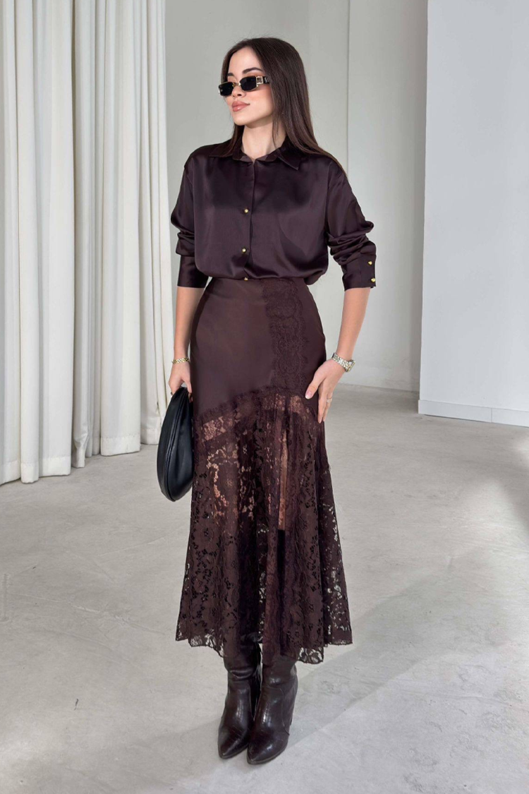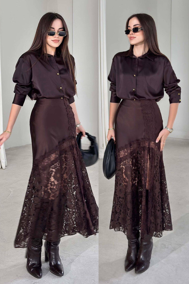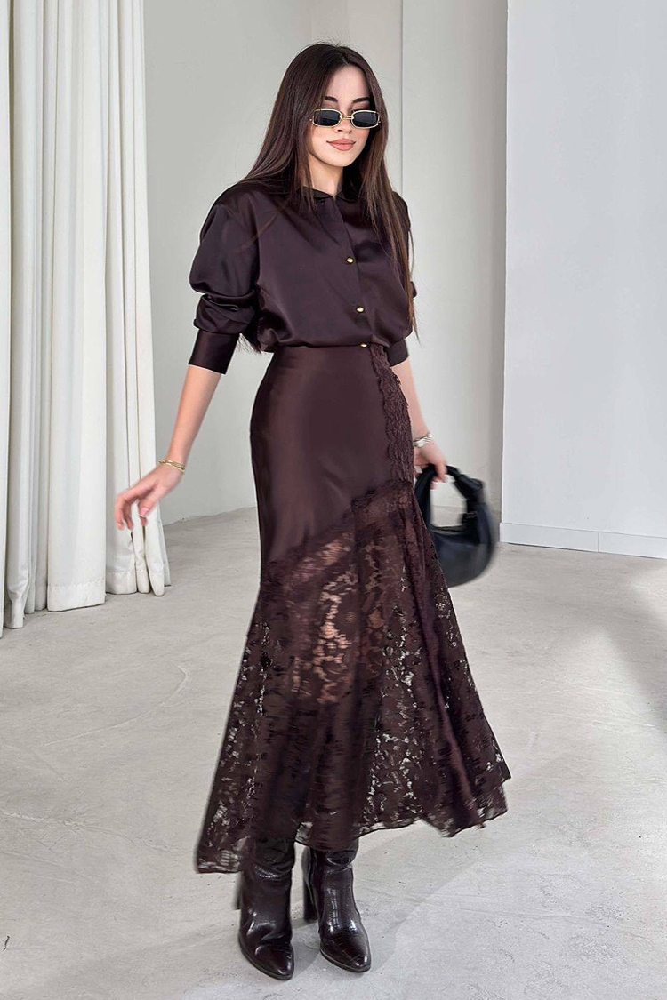 - Моделът е с висока талия, разкроена кройка, сатенена материя и дантела.