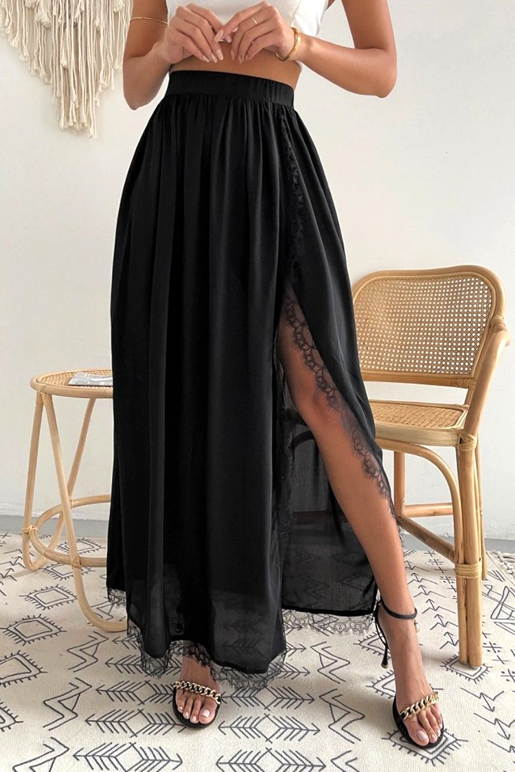 - Моделът е с висока и еластична талия, цепка, дантела и разкроена кройка.