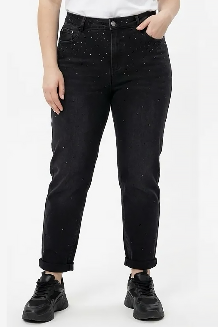 • Моделът е с висока талия, права кройка с ефектен подгъв в края и акцент с камъчета.