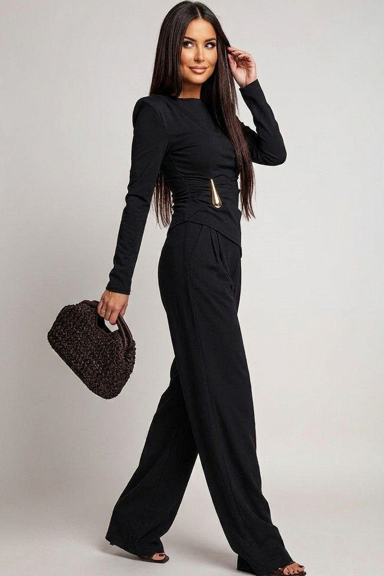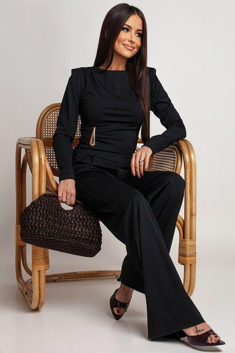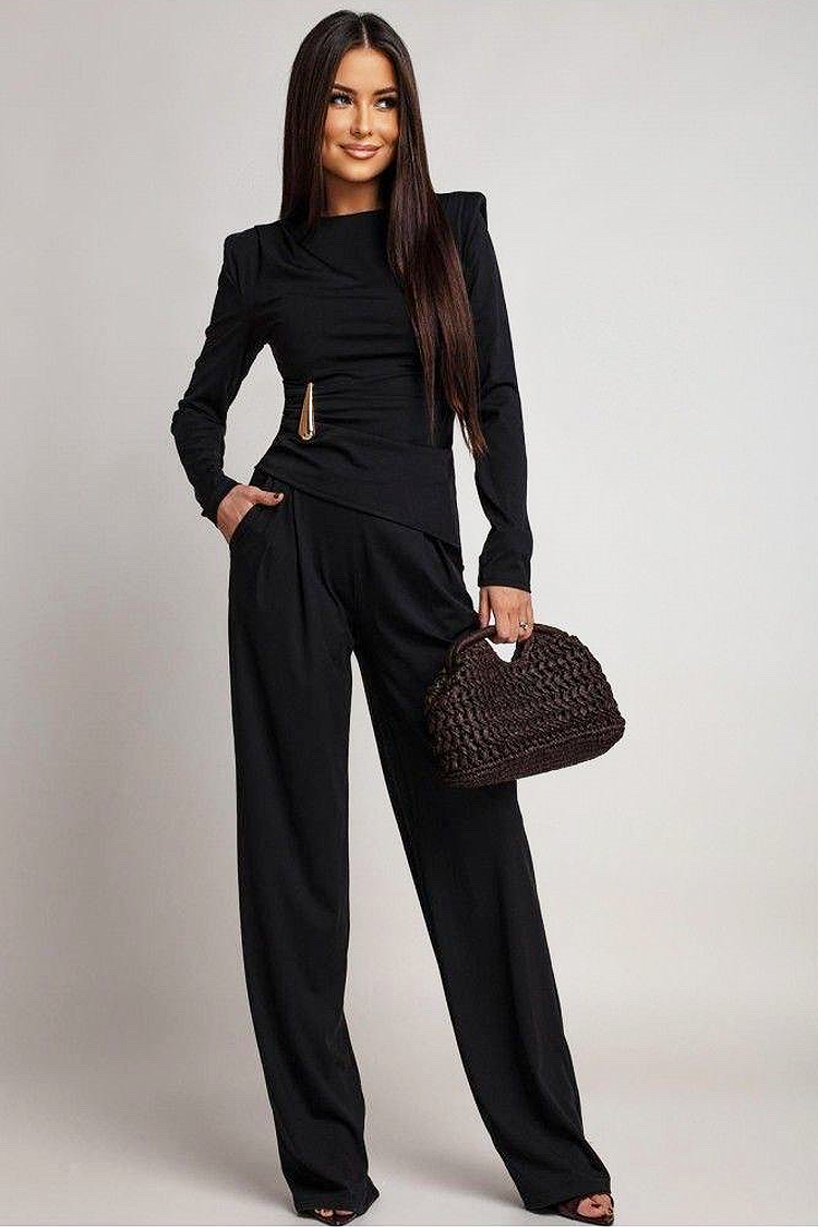 - Ежедневен комплект от две части, състоящ се от блуза и панталон в класически цвят.