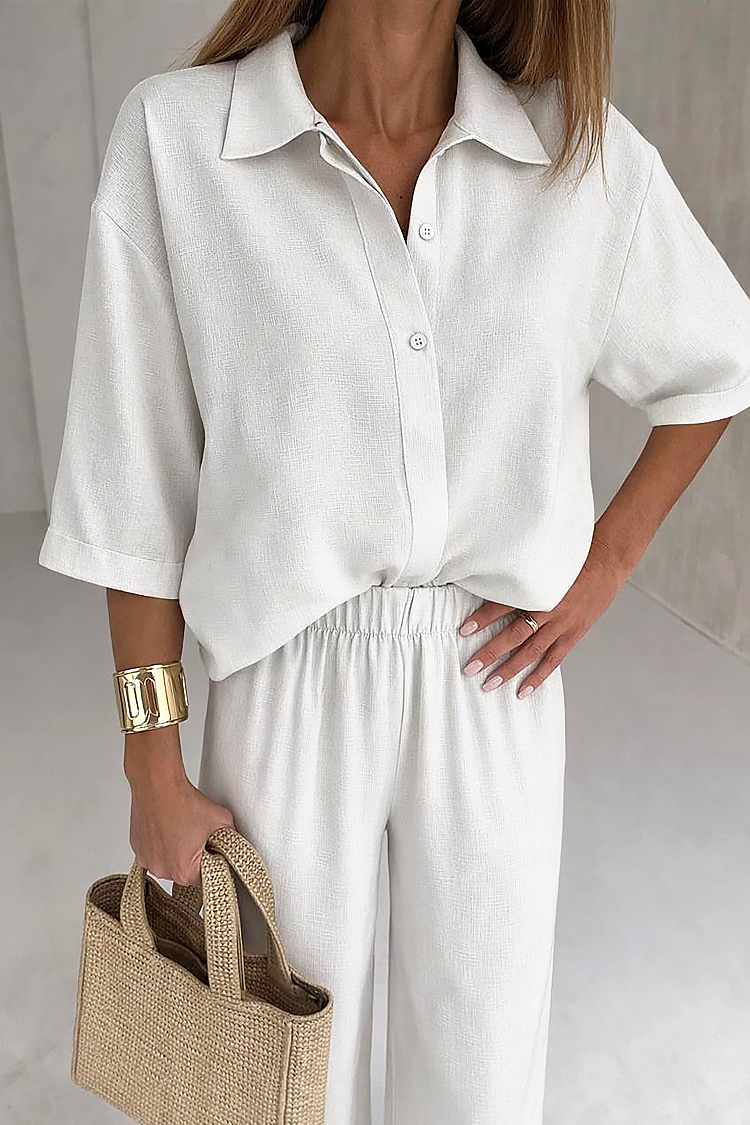 • Горната част е с класическа кройка, ефектен дизайн с къси ръкави, копчета и яка.