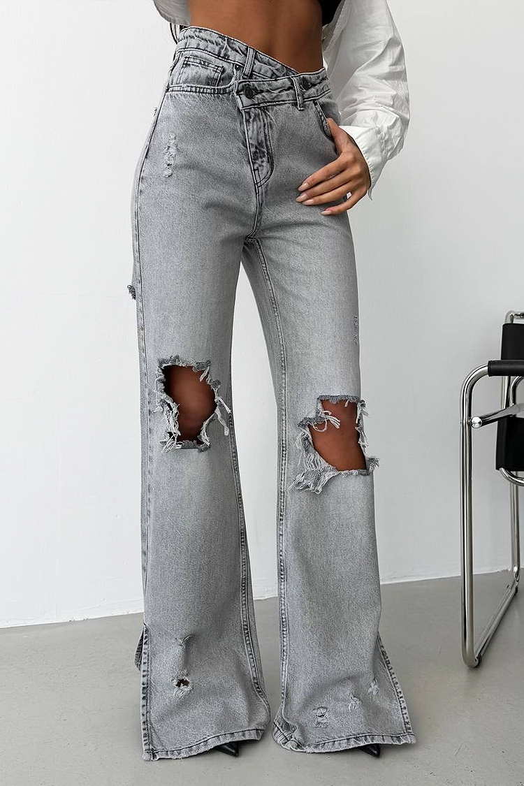 • Моделът е с модерно асиметрично закопчаване и ефектни накъсани детайли.