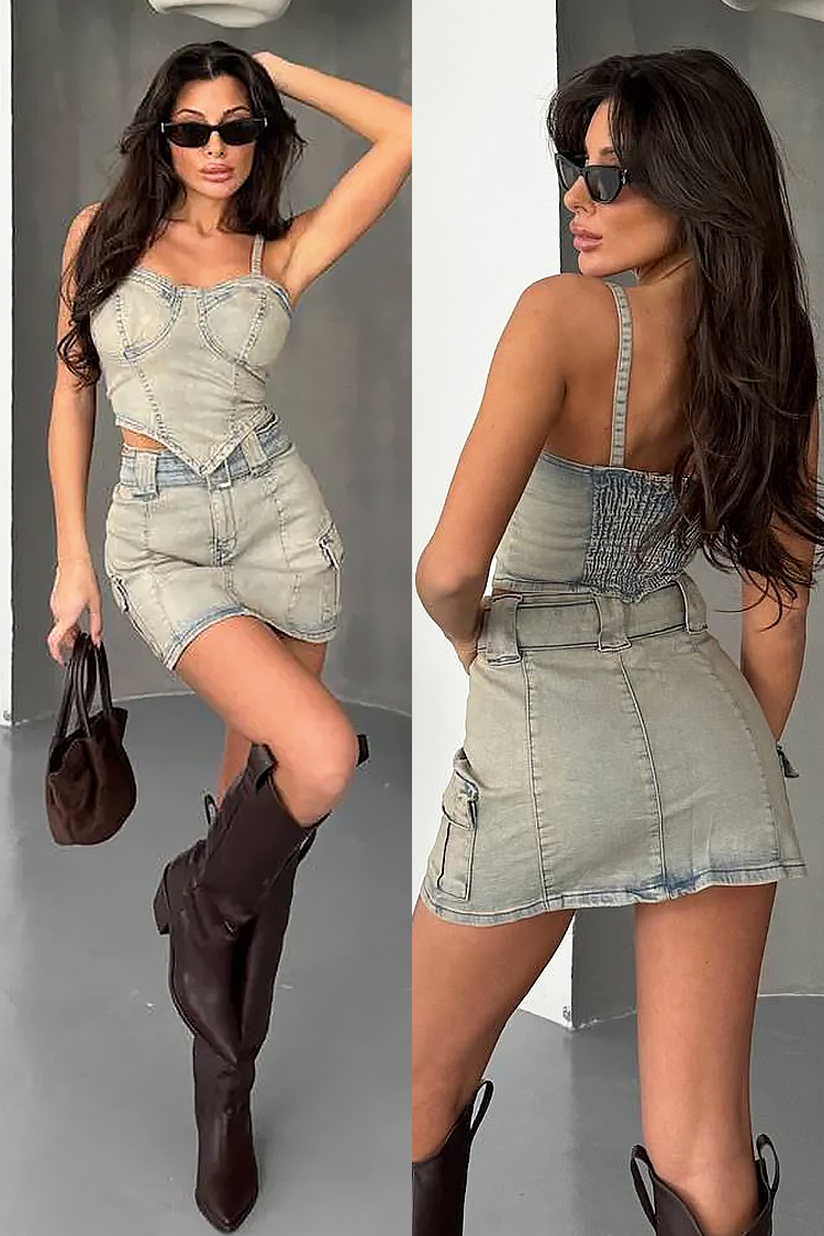 - Дънков комплект от две части: топ и къса пола, подходящ за ежедневни тренди визии.