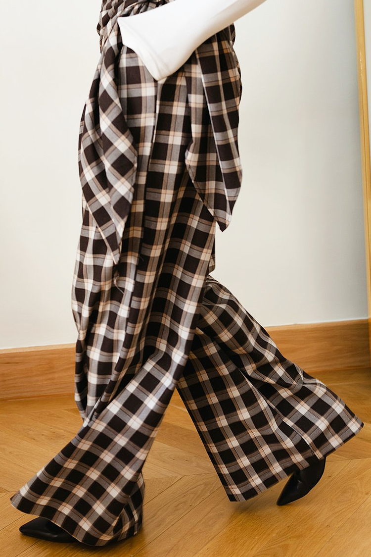 - Моделът е с висока талия, свободна кройка, кариран десен и шалте на талията, което може да се сваля.