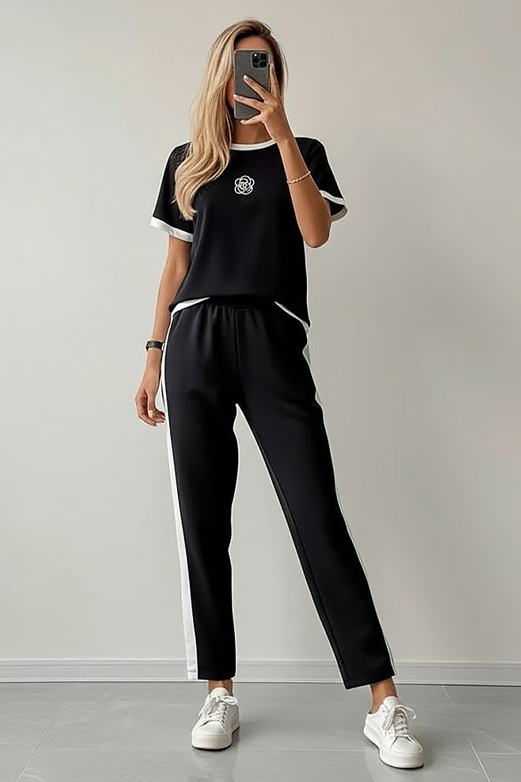 - Ежедневен комплект от две части, състоящ се от тениска и панталон в ТРЕНДИ цвят.