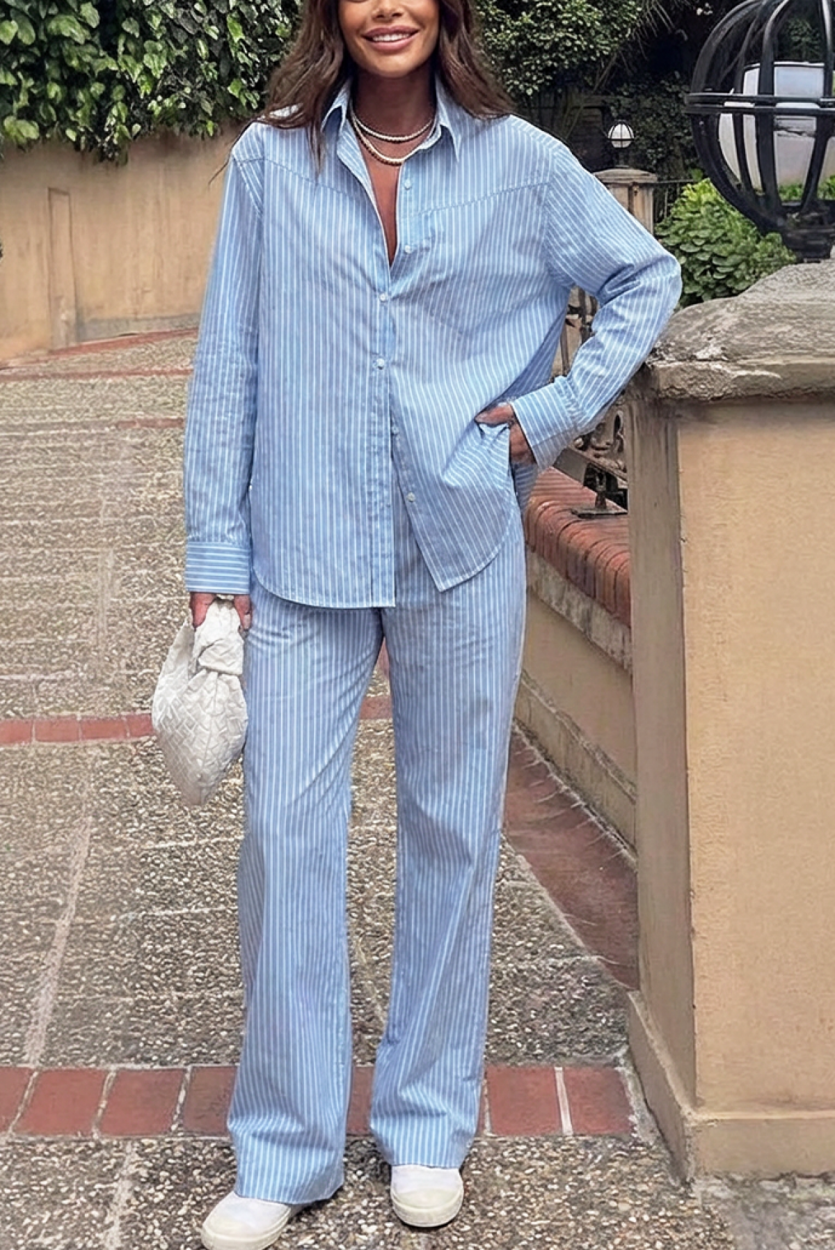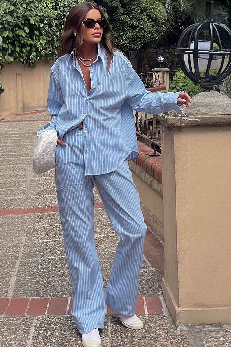 • Ризата е с овърсайз кройка, яка, копчета и десен на райета, а панталонът е със свободен дизайн и висока талия.