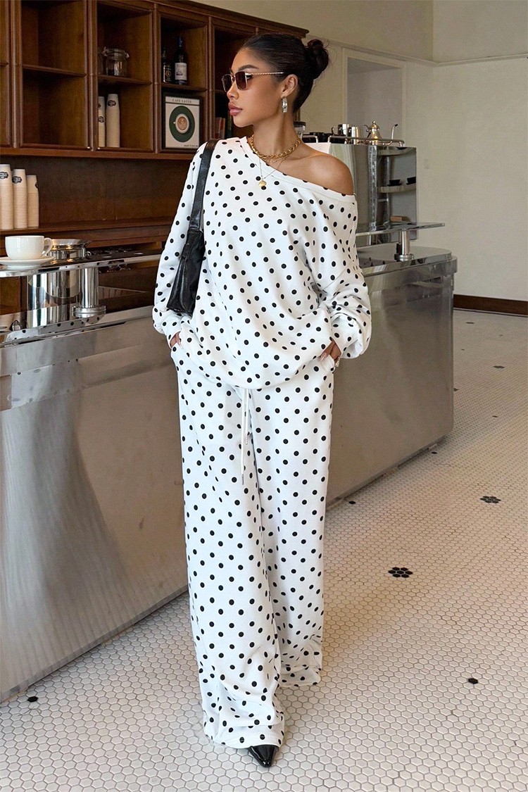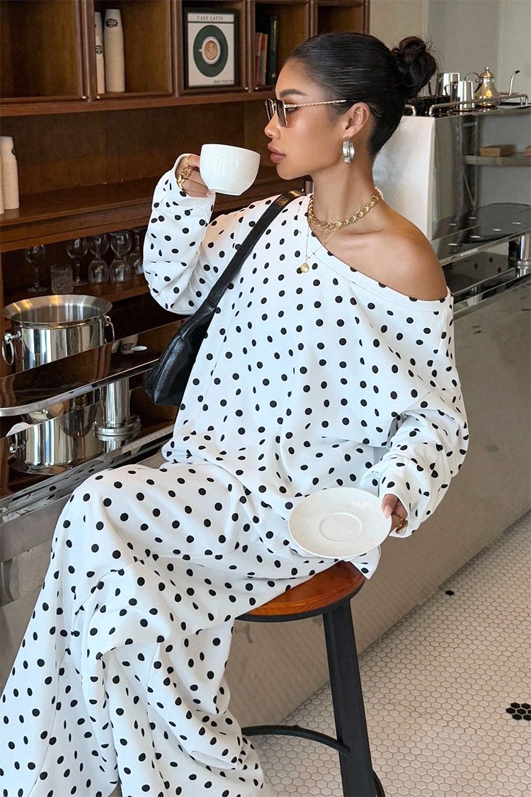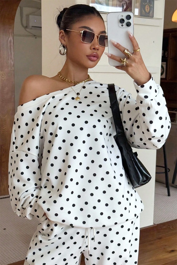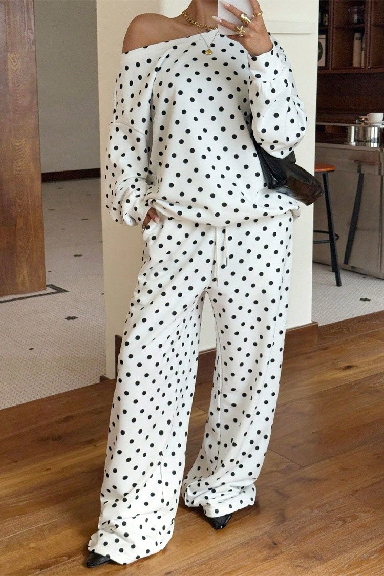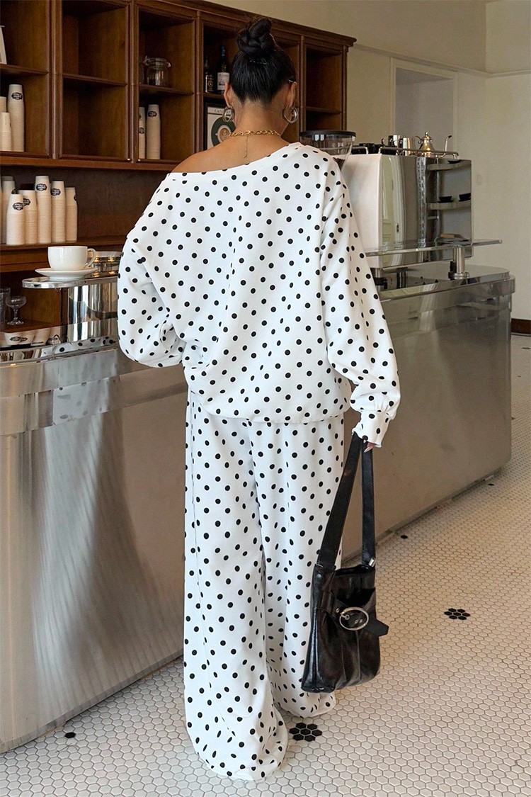 - Ежедневен дамски комплект от две части с десен на точки, подходящ за тренди визии.
