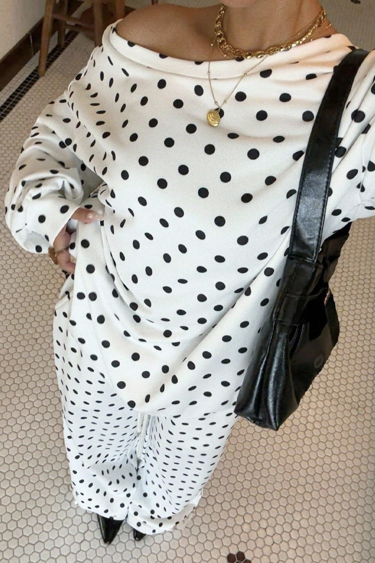 - Блузата е с овърсайз кройка, десен на точки, а панталонът е със свободен дизайн и висока талия.