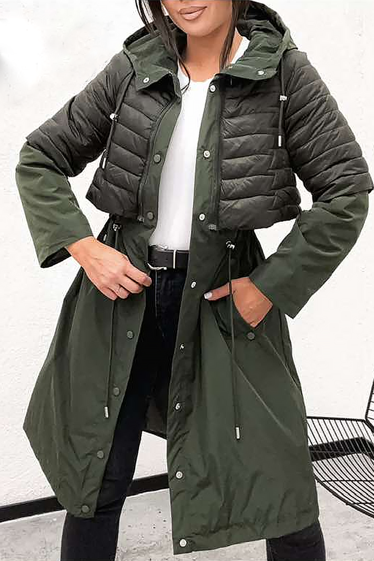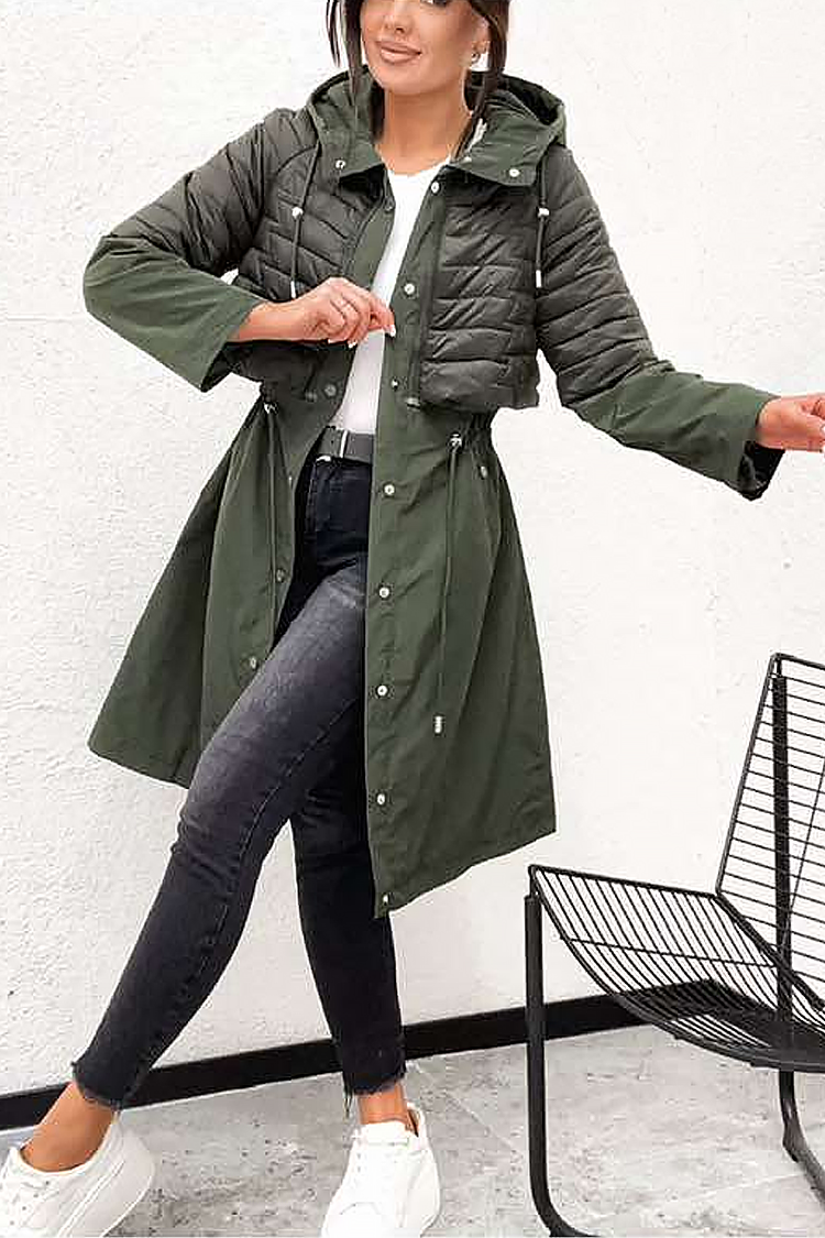 - Моделът е с качулка, копчета по цялата дължина отпред, ефектна комбинирана материя и странични джобове.