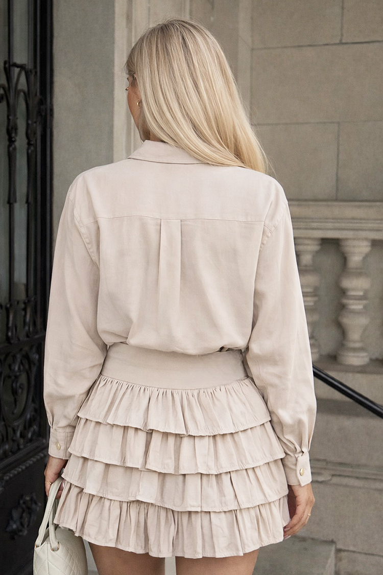 - Долната част е пола-панталон с висока талия, която оптически ще издължи силуета.