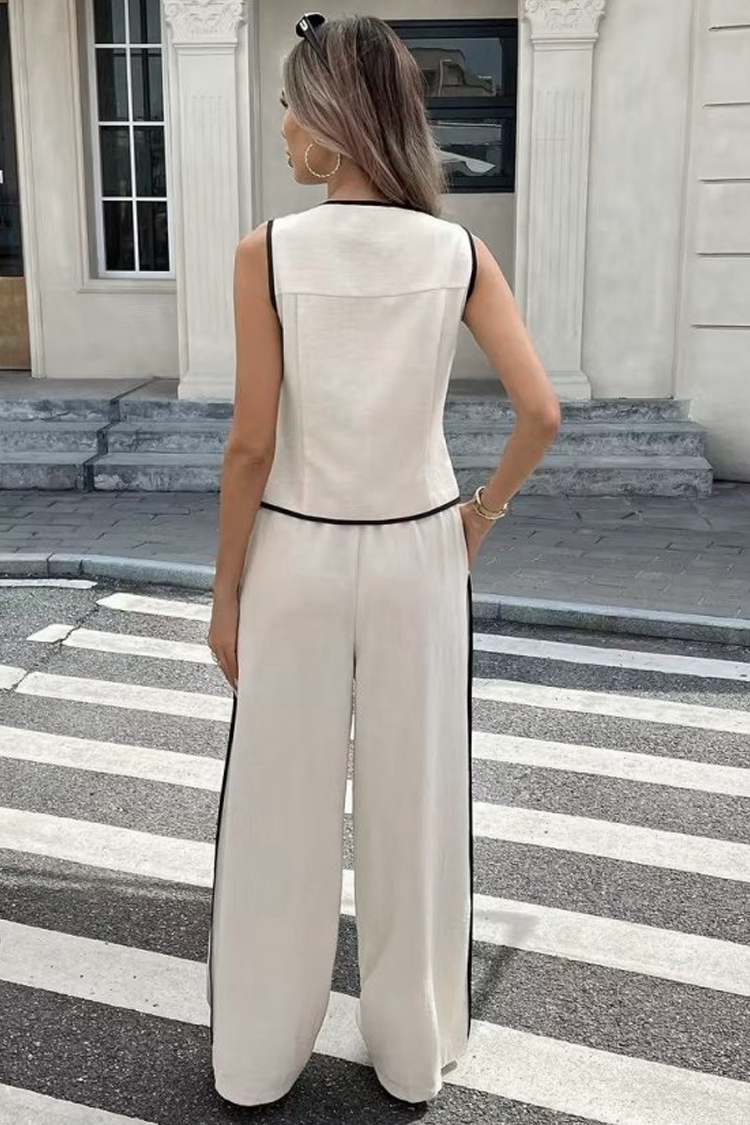 - Горната част е елегантен елек с копчета, а панталонът е със свободен дизайн и висока талия.