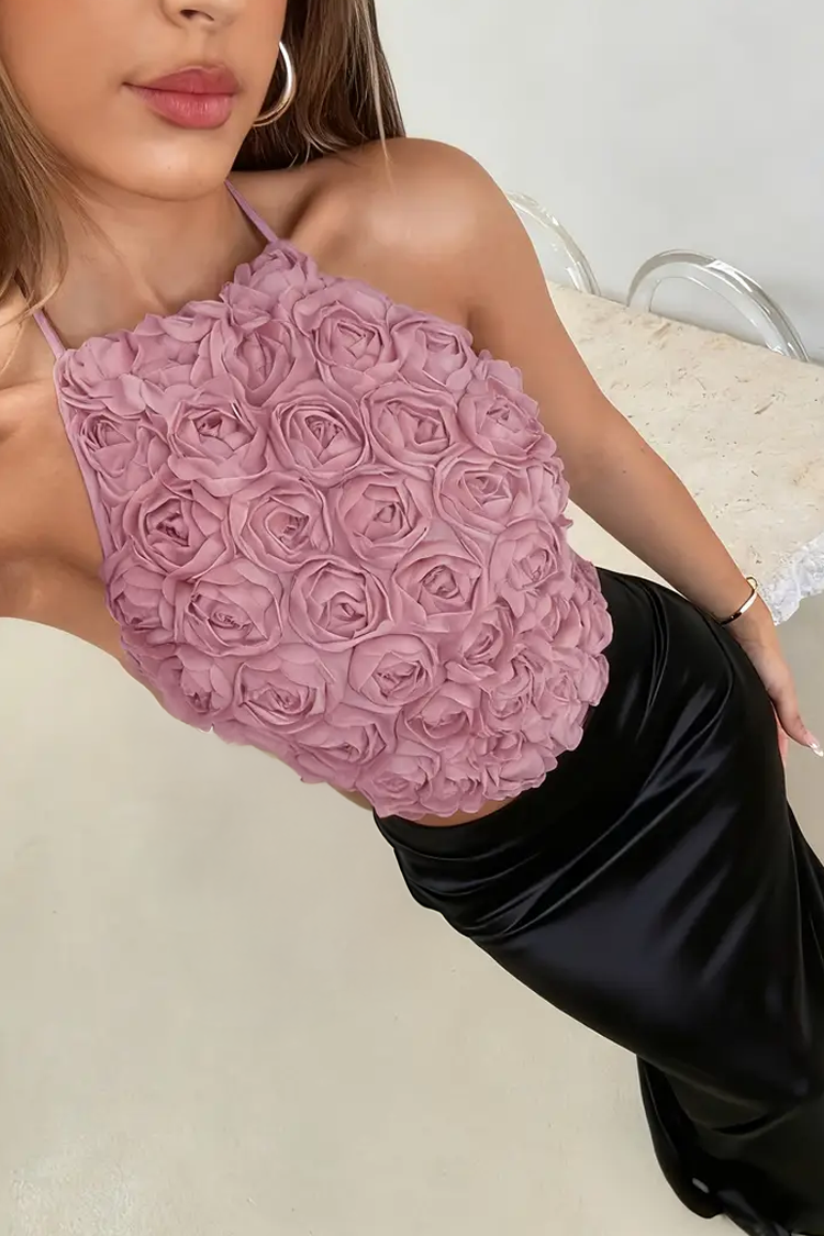 - Моделът е с кокетен дизайн, розов цвят, халтер деколте и 3D цветя.