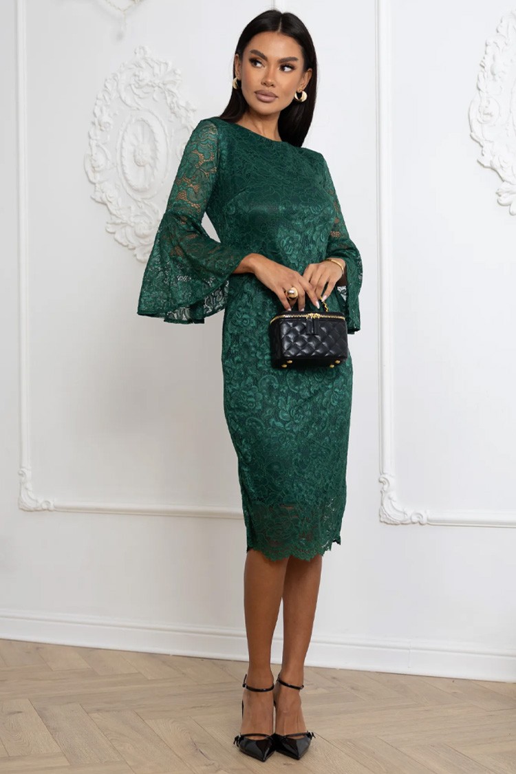 - Моделът е с миди дължина, вталена кройка и ефектни ръкави.