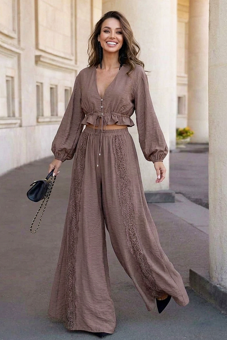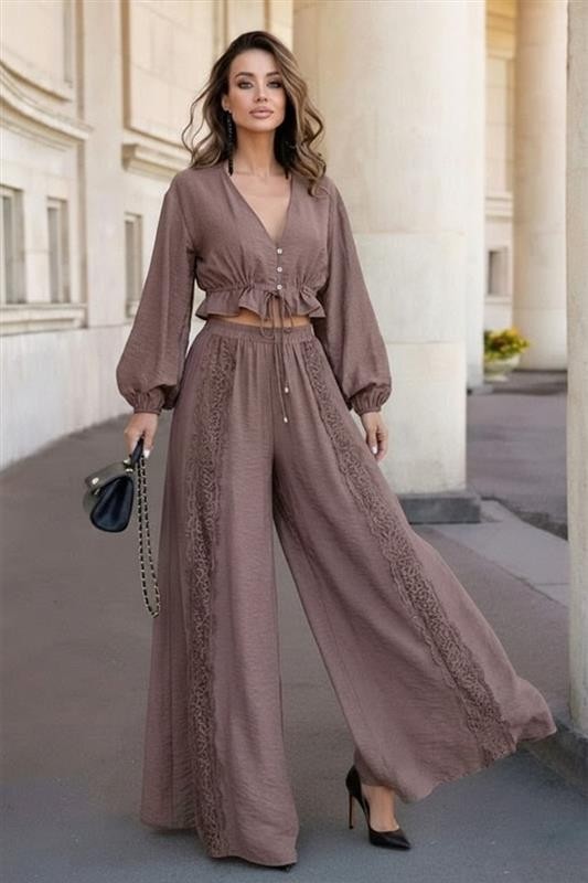 - Блузата е с кроп-топ дължина и ефектни ръкави, а панталонът е със свободен дизайн и висока талия.