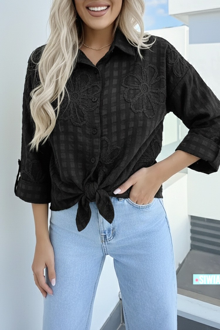 - Моделът е с дълги ръкави, кокетен дизайн и атрактивен акцент с цветя по дължината.