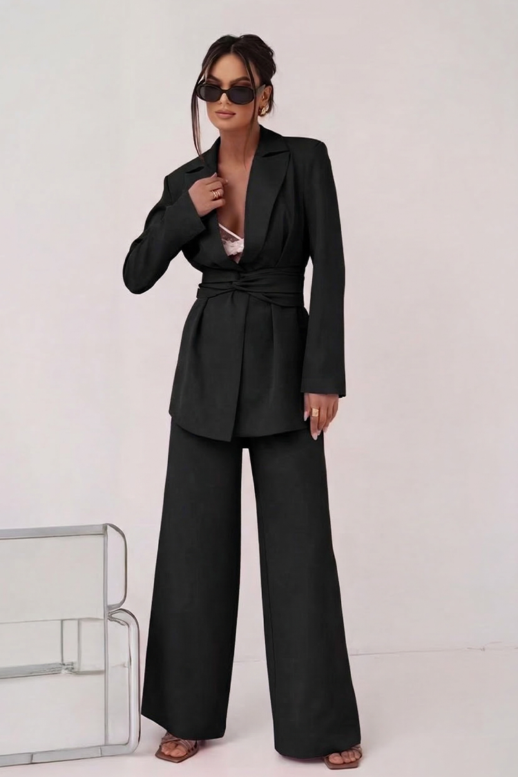 - Горната част е с атрактивен дизайн, дълги ръкави и колан от същата материя.