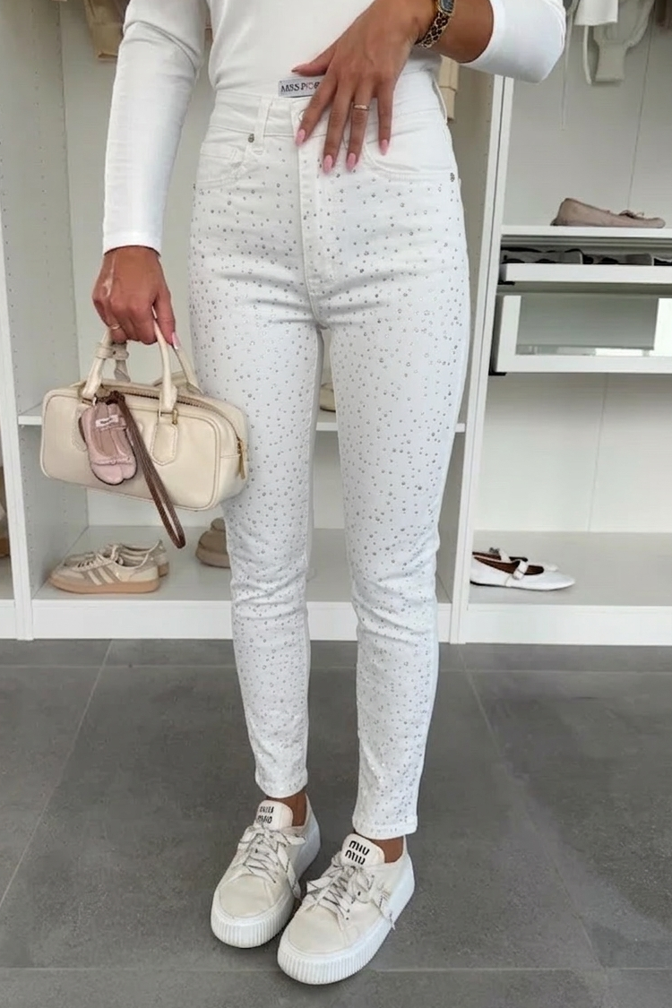 - Моделът е с висока талия, кройка по тялото, бял цвят и блестящи акценти по цялата дължина.