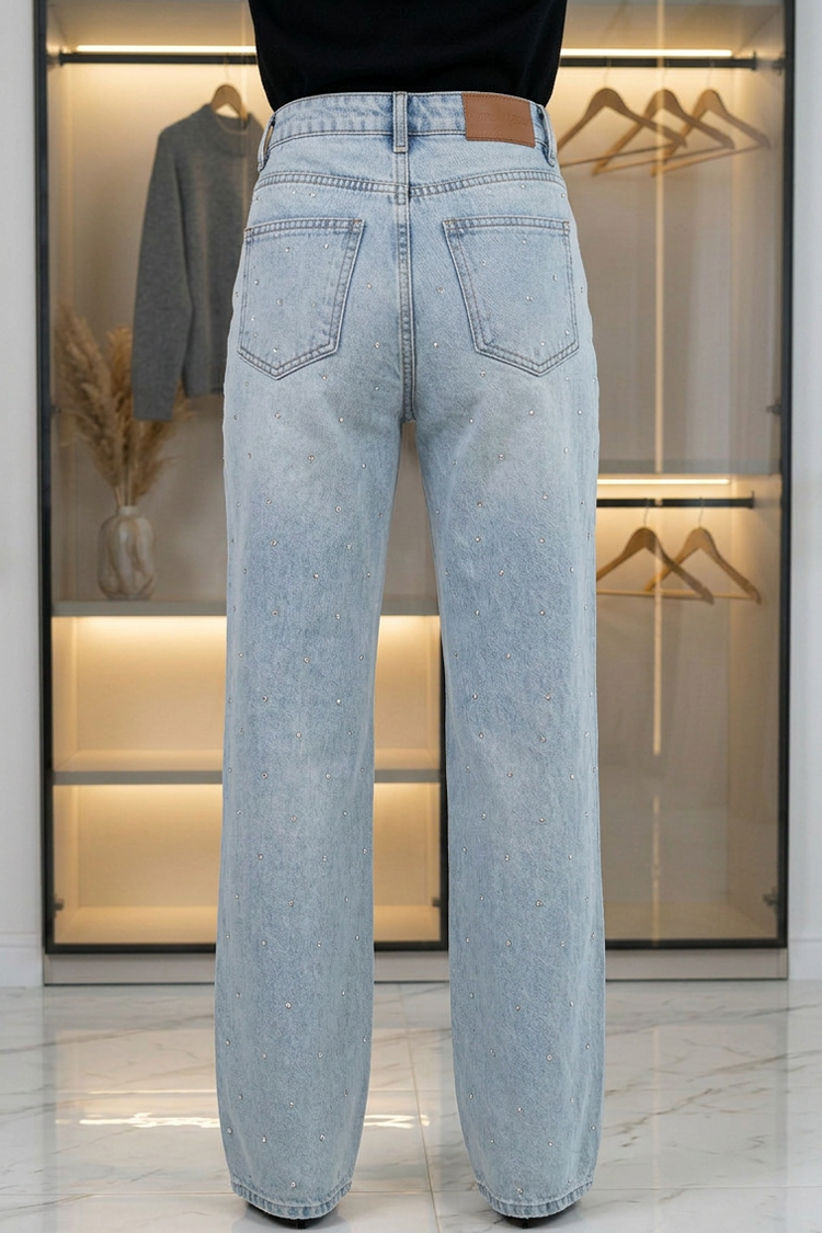 • Моделът е с висока талия, права кройка, блестящи детайли и разкъсан ефект.