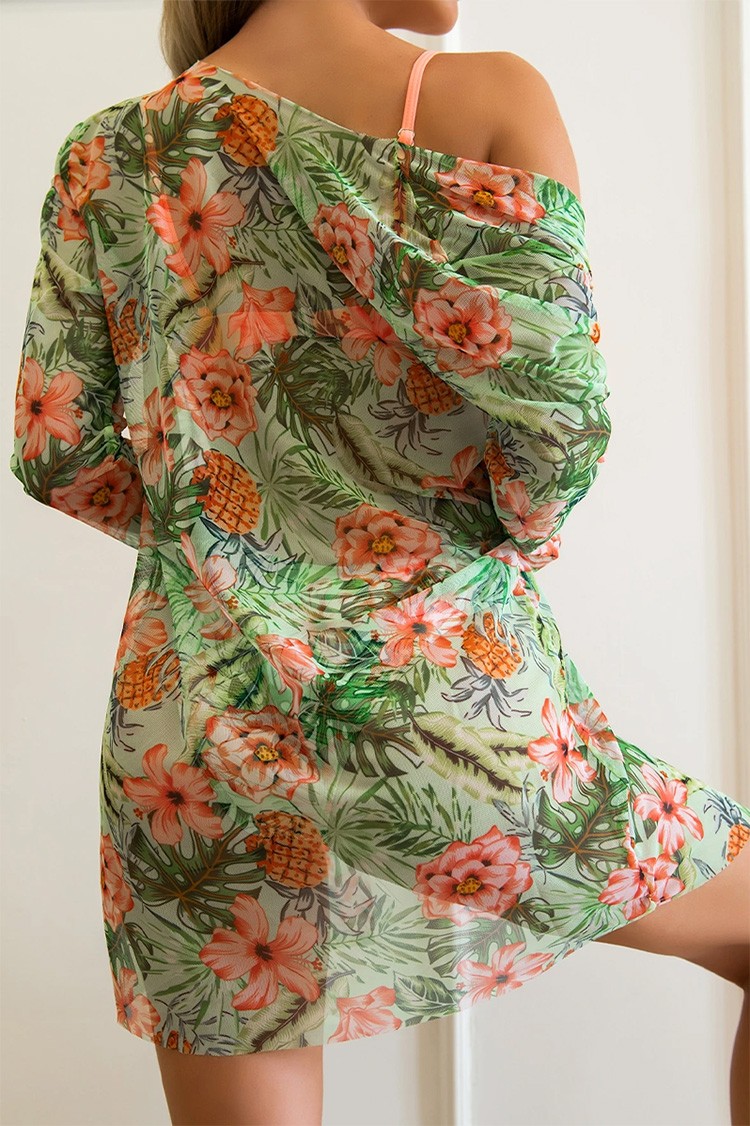 - Долнището е с класическа талия с изрязани детайли в предната си част и удобна кройка. Пареото е с тропически принт, полупрозрачно и със средна дължина.