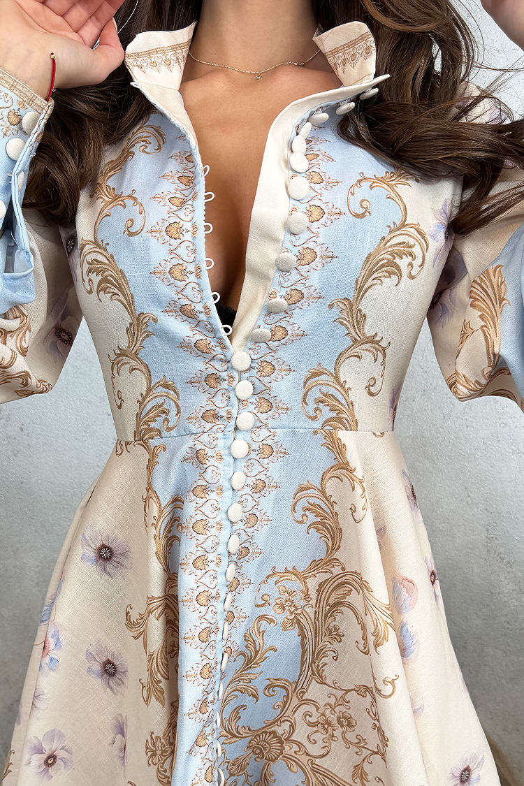 - Роклята е с мини дължина, копчета по цялата дължина, яка и многоцветен десен.