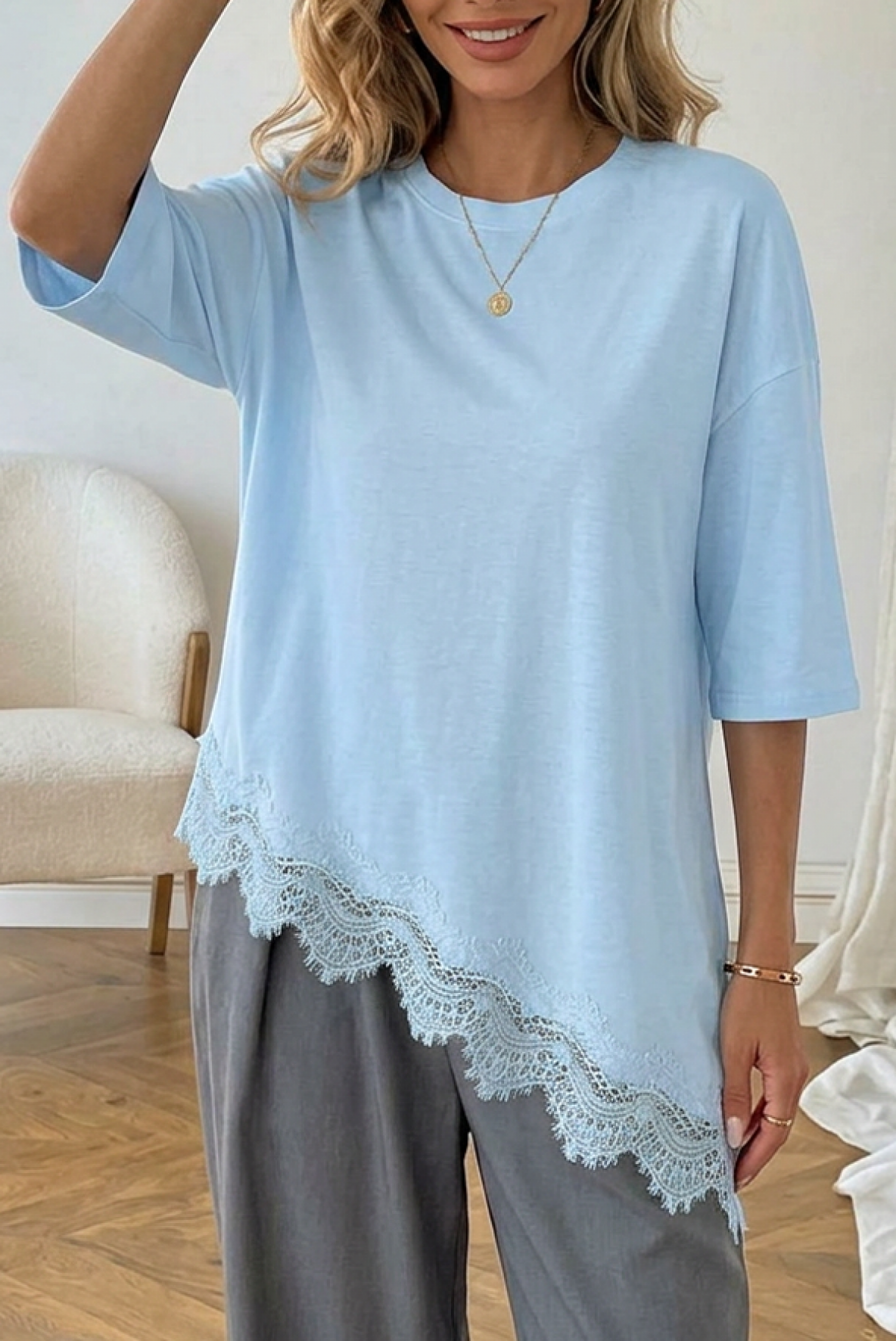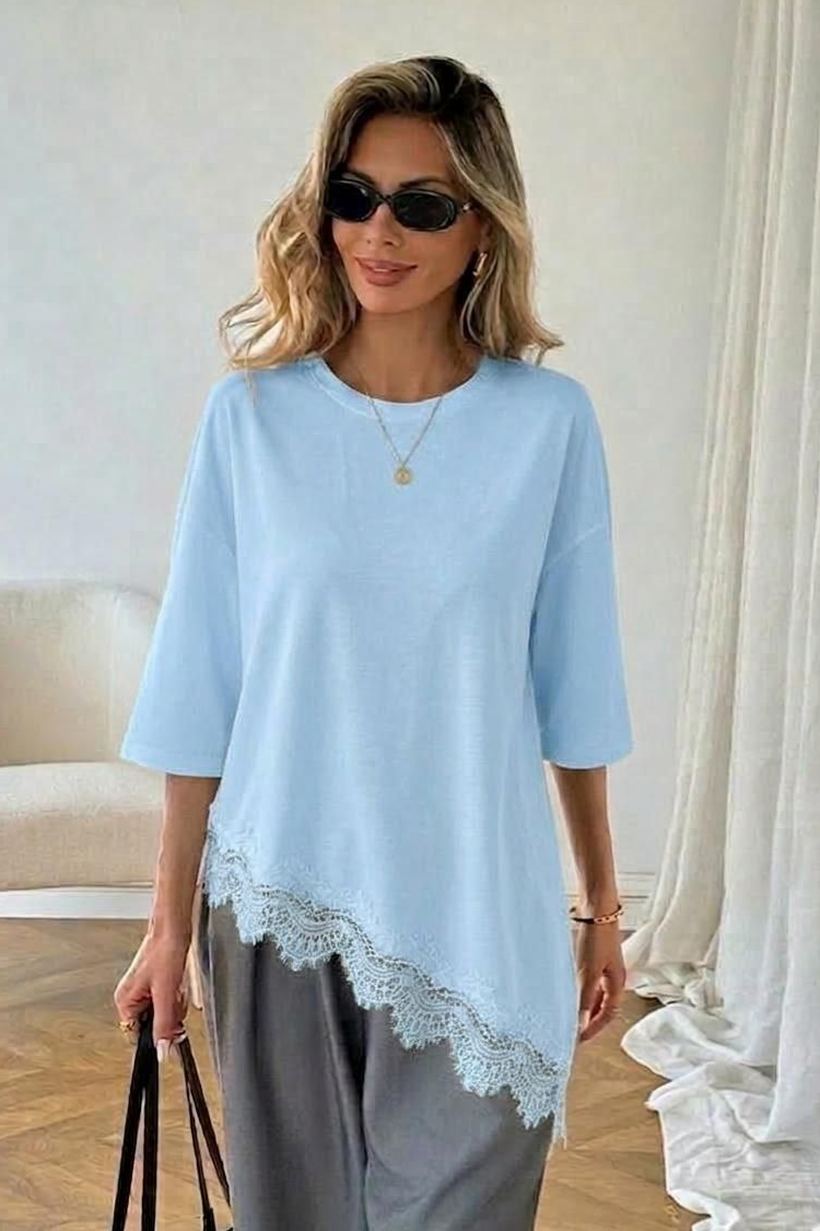 - Моделът е със свободна, асиметрична кройка и ефектна ажурна дантела в края.