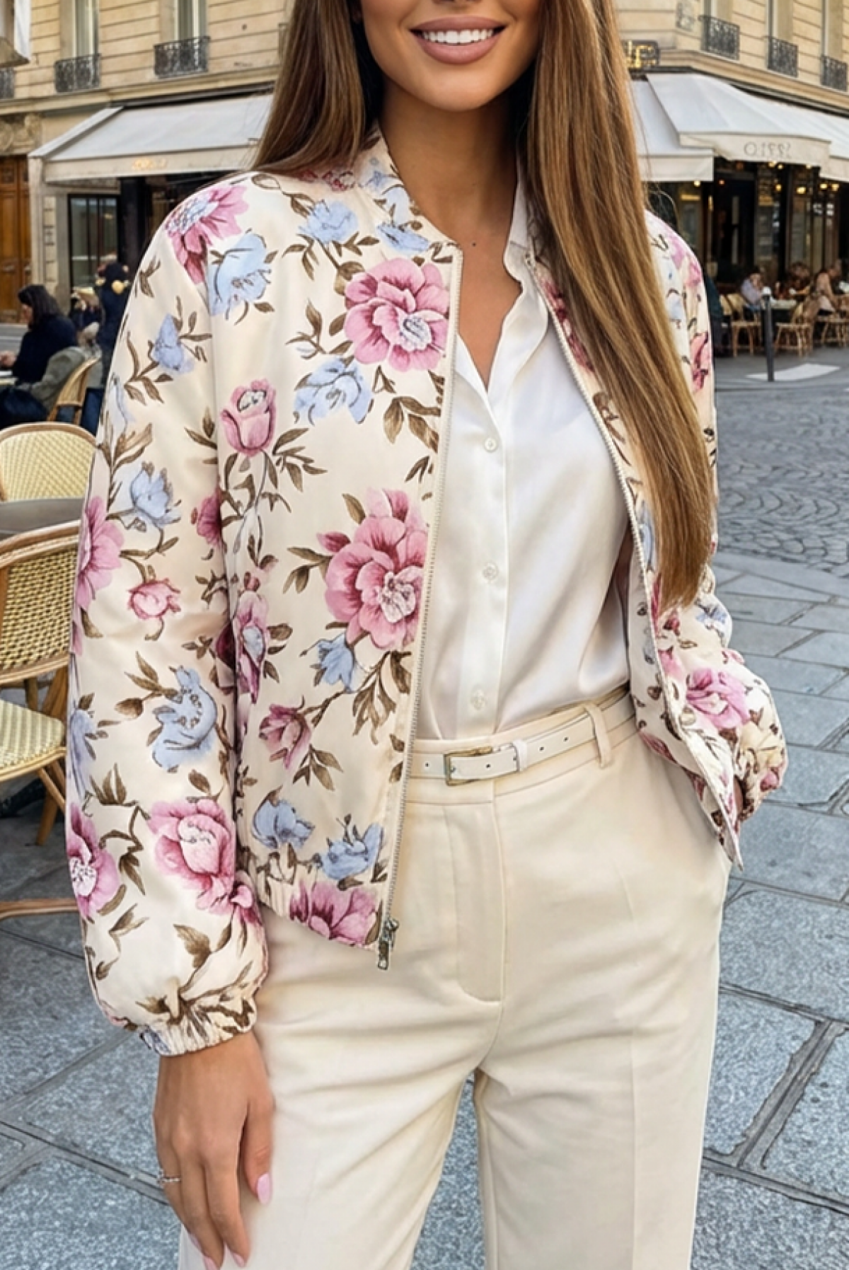 - Моделът е с цип по цялата дължина отпред, къса дължина и ефектен флорален десен.