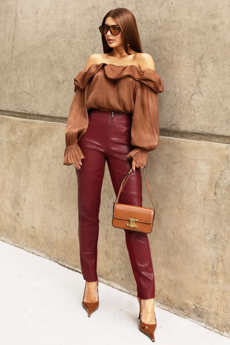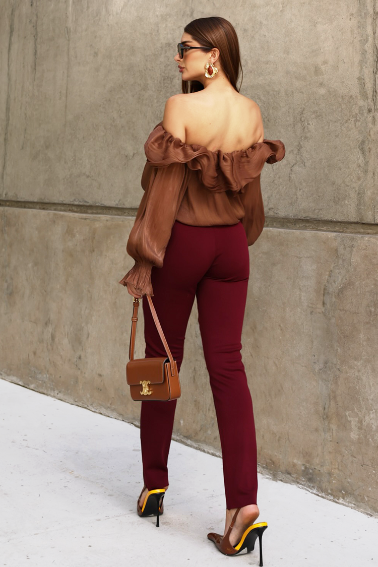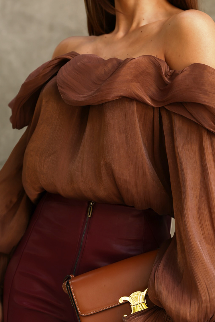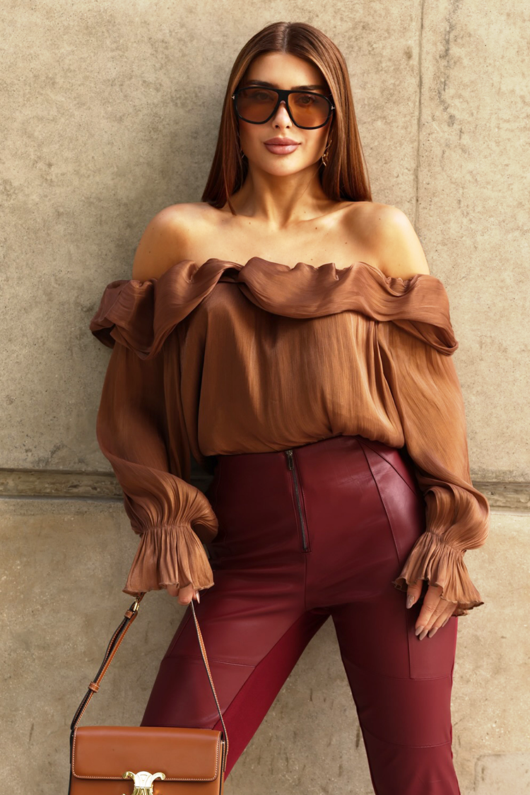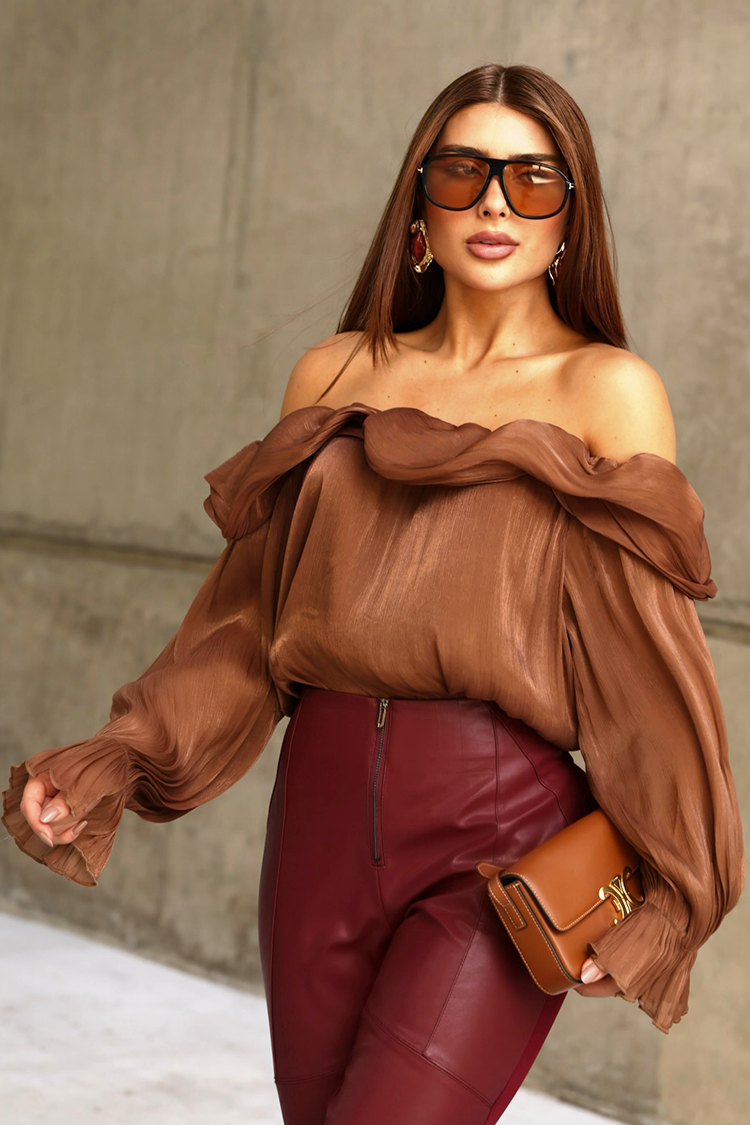 • Моделът е с дълги ръкави,  кокетен дизайн, открити рамене и светлокафяв цвят.