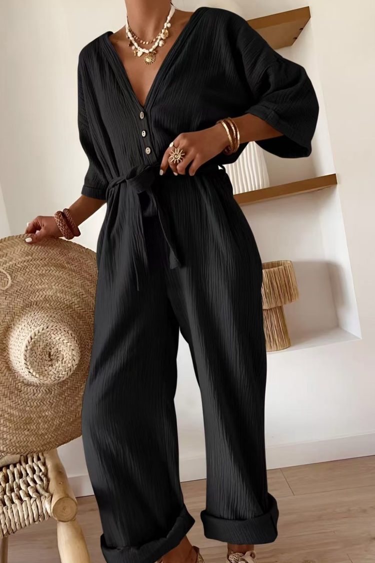 • Моделът е с комфортна кройка, широки крачоли, елегантно деколте с копчета и колан на талията.