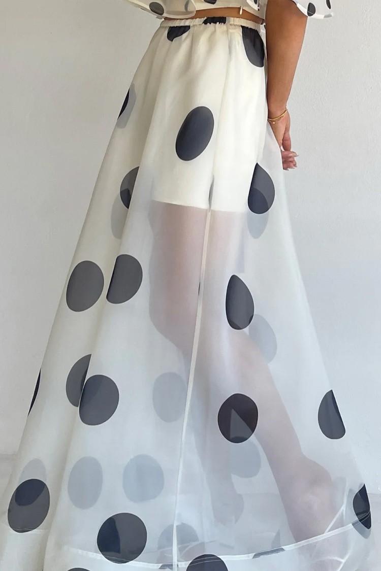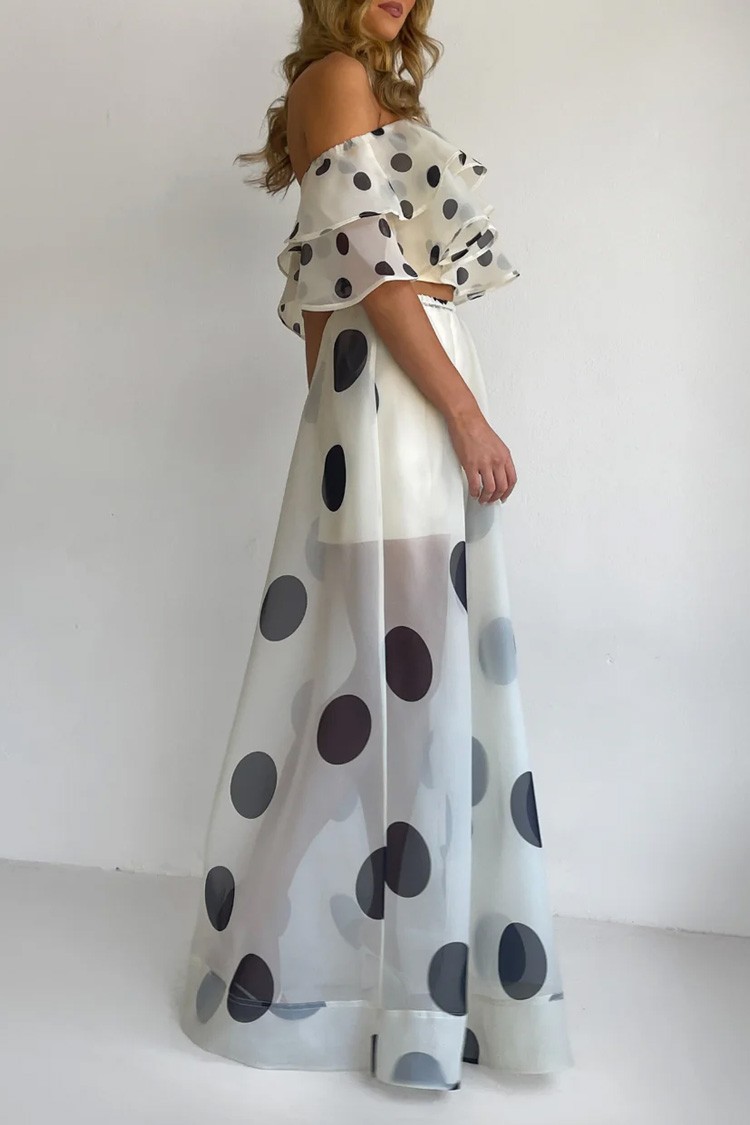 - Горната час е топ е с кроп дължина, асиметрична кройка и ефектни волани.