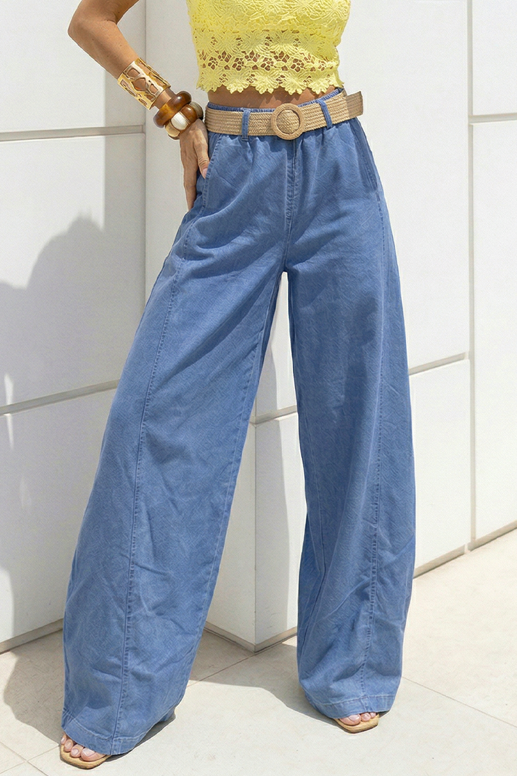 - Моделът е с висока талия, свободна кройка, джобове, светлосин десен и колан.