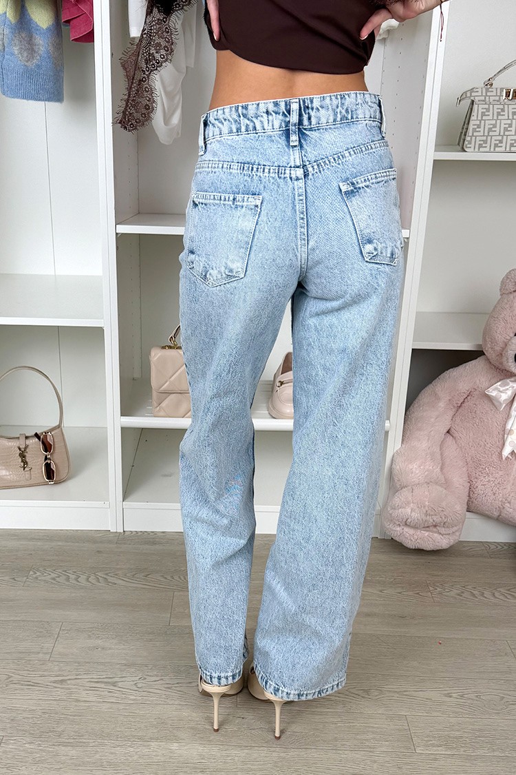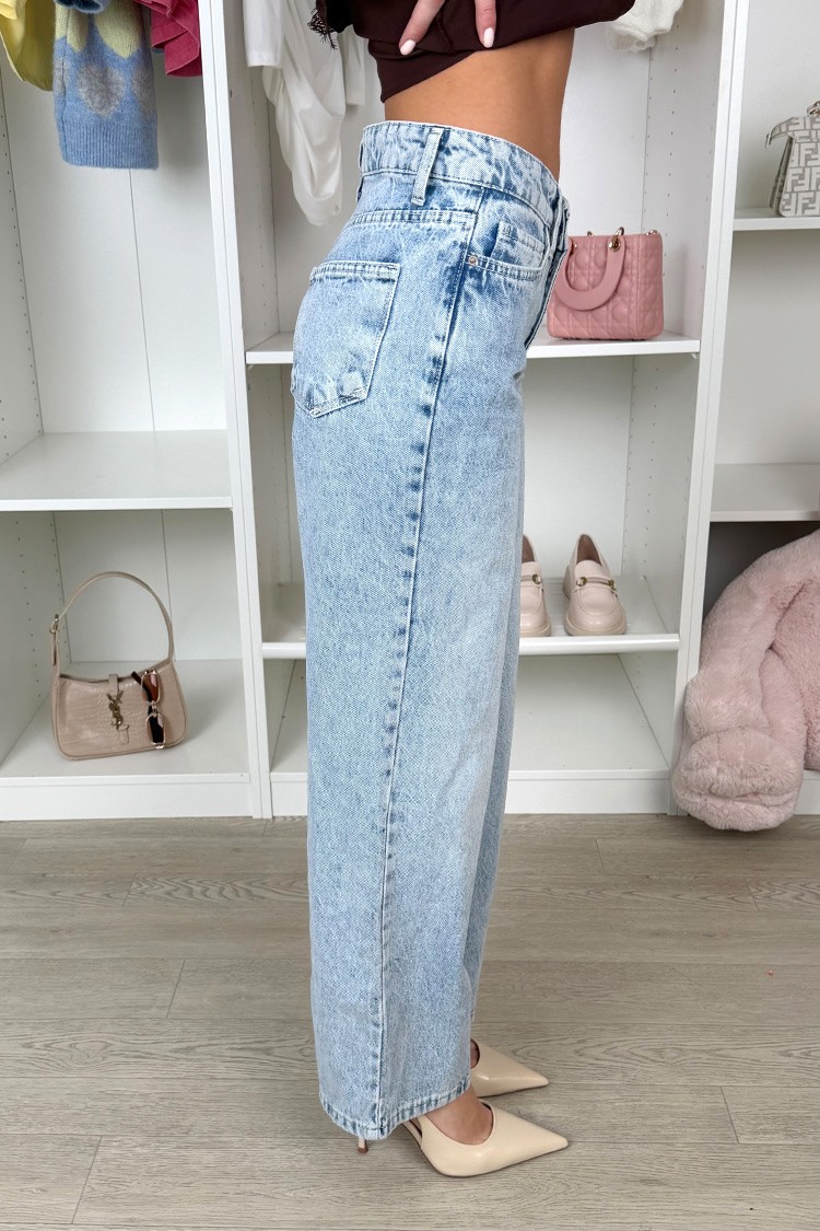 - Моделът е със средна талия, свободна кройка, джобове и атрактивен светлосин десен.