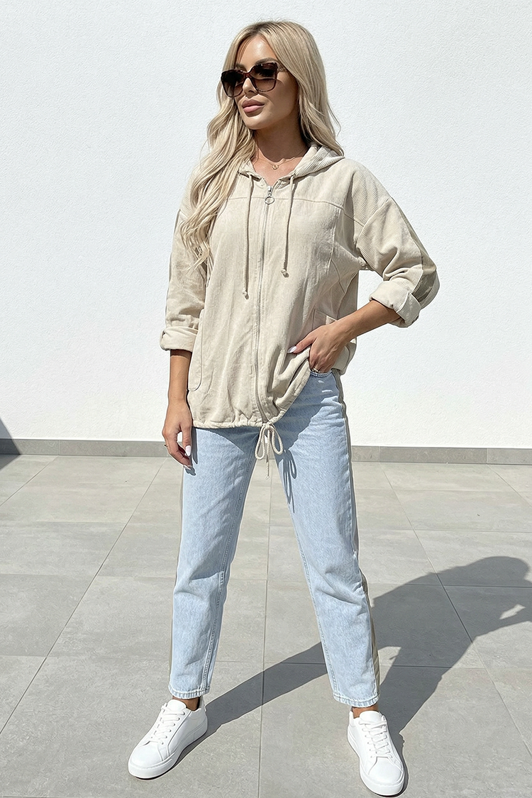 - Моделът е с качулка, цип по цялата дължина отпред, връзки, странични джобове и едноцветен десен.