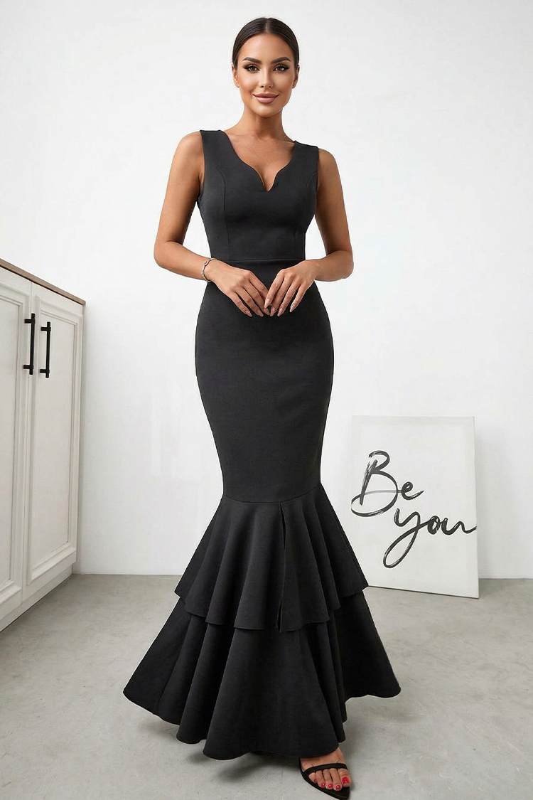 - Моделът е с кройка тип ''русалка'', елегантни волани, кройка по тялото, V-образно деколте и черен цвят.