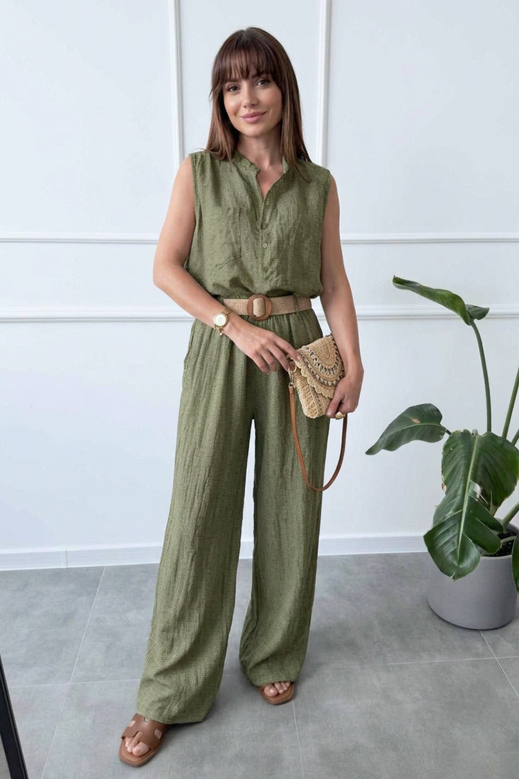 - Дамска риза със свободна кройка, без ръкави и с копчета по цялата дължина, осигуряваща комфорт и елегантност.