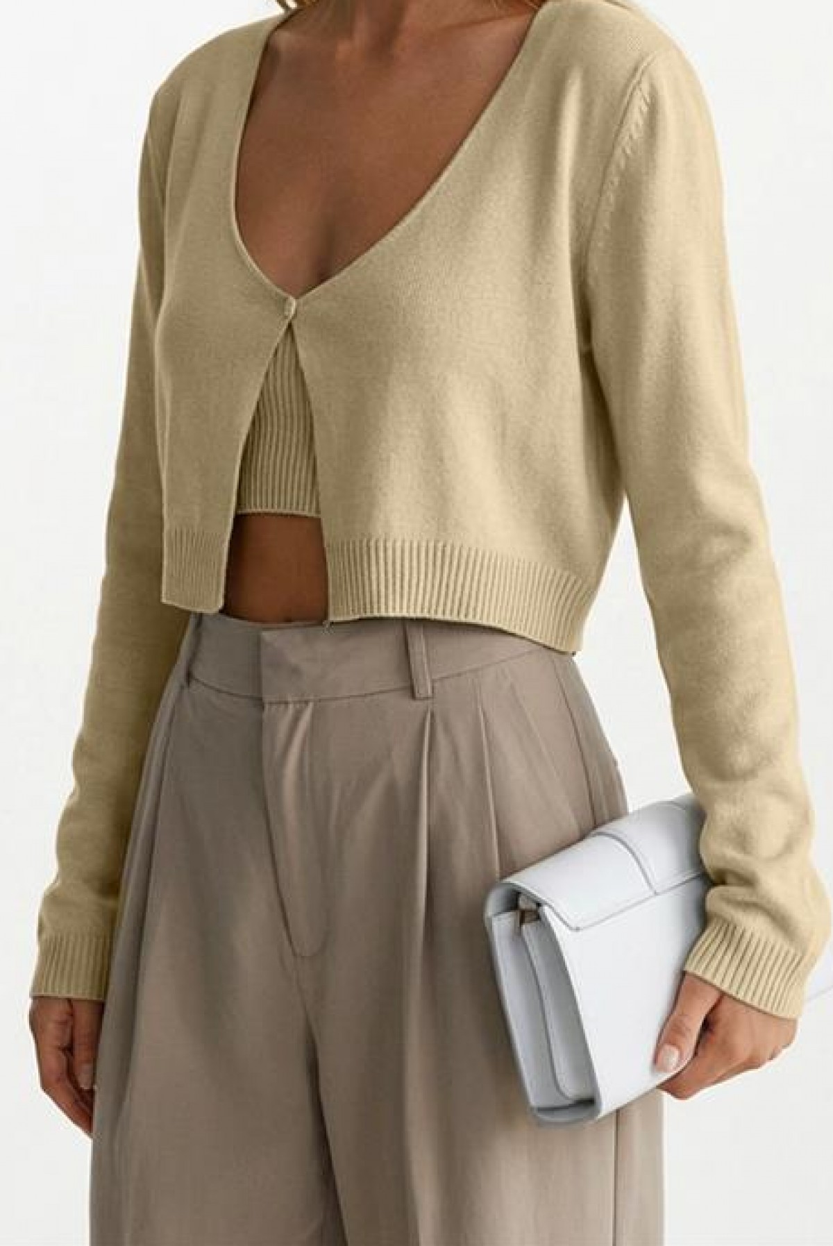 - Топът е със стилен дизайн, рипсена материя, кроп дължина и едноцветен десен.