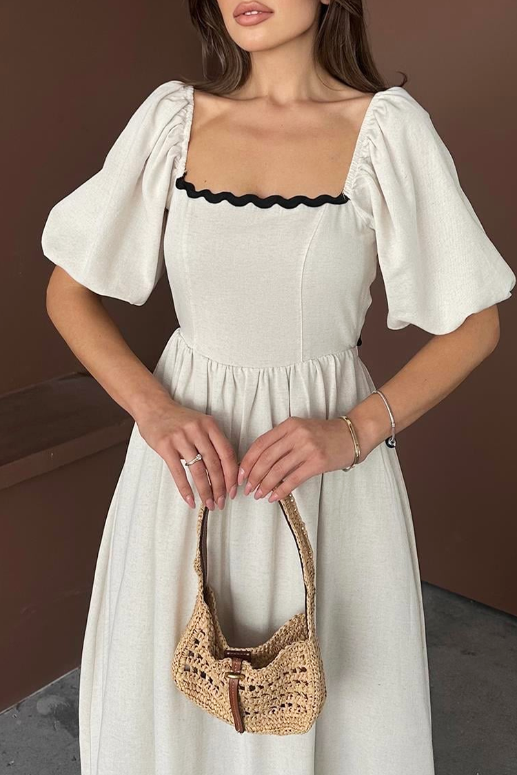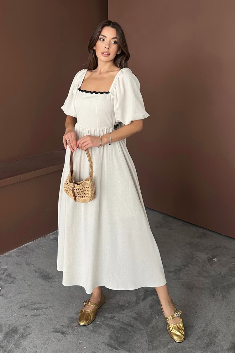 - Роклята е с миди дължина, тренди силует, квадратно деколте, къси буфан ръкави, черни детайли и връзки отзад.