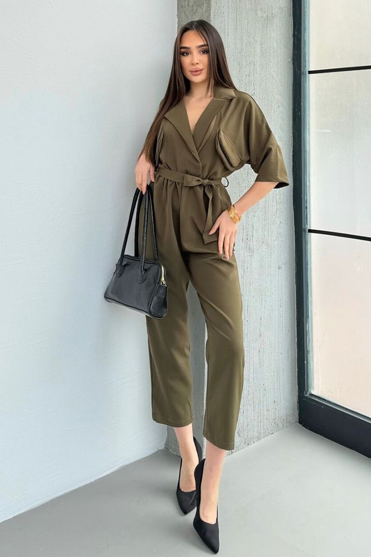 - Моделът е с тренди дизайн, елегантна яка, каки цвят, странични джобове, къси ръкави и колан от същата материя.