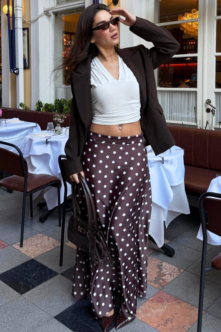 - Моделът е с разкроен дизайн, средновисока талия, десен на точки и кафяв цвят.