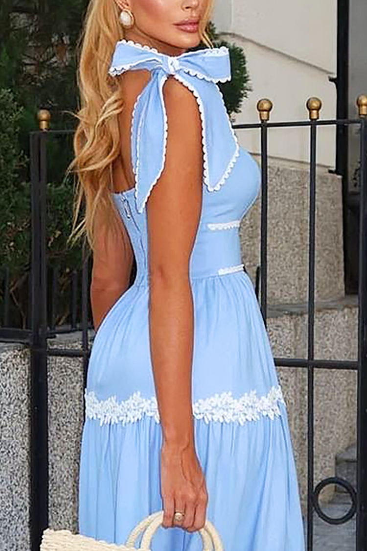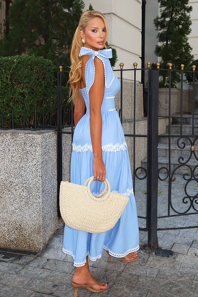 Тази ефирна рокля в син цвят е идеален избор за топлите дни. Носи усещане за свежест и стил – подходяща и за най - специалните летни поводи. Горната част е с бюстие,а долната част е свободно разкроена и с нежни флорални детайли от дантела, които придават ефирност към всяка стъпка. Дизайнът ѝ съчетава класическа линия с романтични акценти и ефектни презрамки с панделки, които придават уникален и запомнящ се завършек.