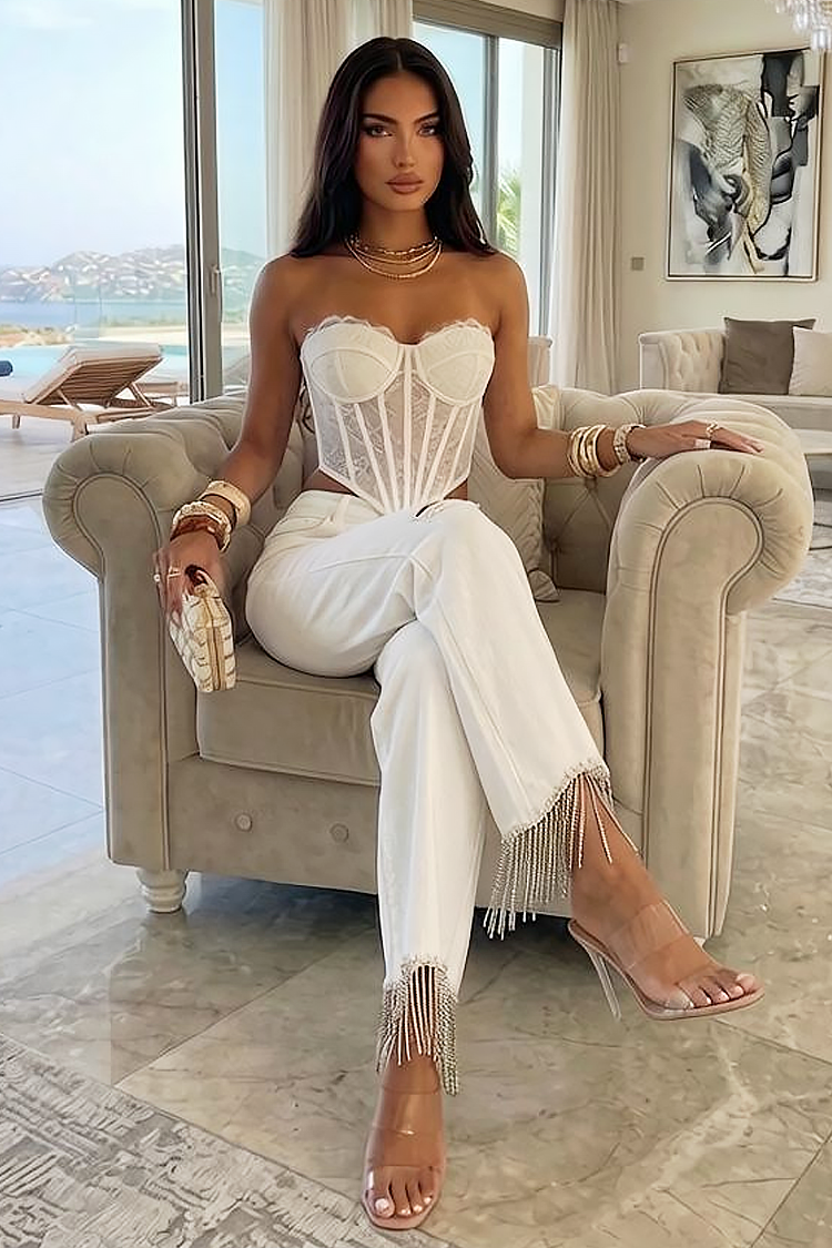 Истинският акцент са фините ресни в долната част на крачолите – деликатен, но много ефектен елемент, който подчертава глезените и създава усещане за лукс. Лекото накъсване при коляното добавя модерна нотка и контраст към елегантната визия.