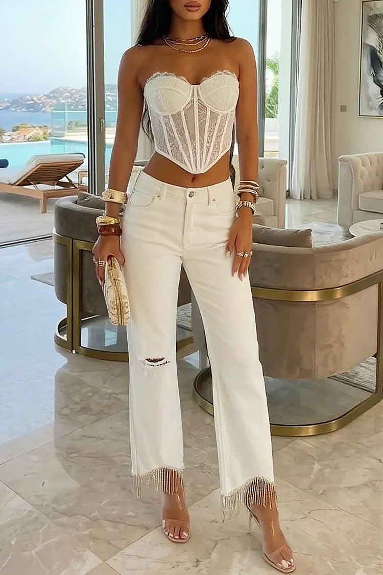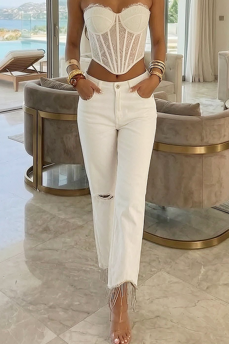 дамски бели дънки с ресни и накъсани елементи LURISA