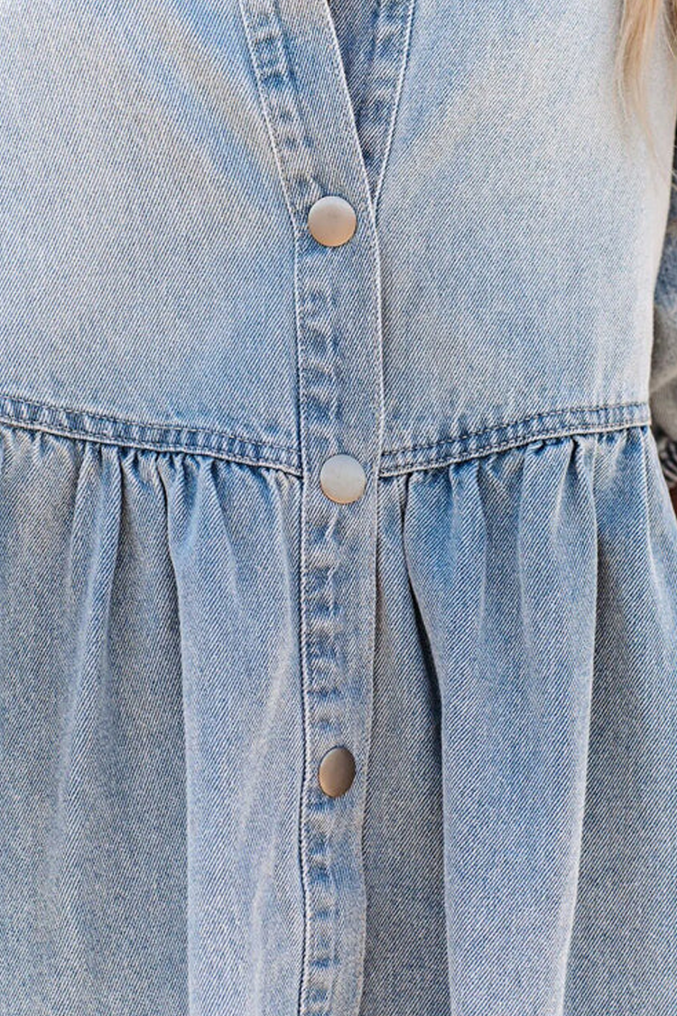 Меката деним материя пада естествено по тялото, а леко обемните ръкави и копчетата отпред по цялата дължина придават модерен акцент. Деликатно набраната талия оформя женствен силует, без да ограничава удобството.