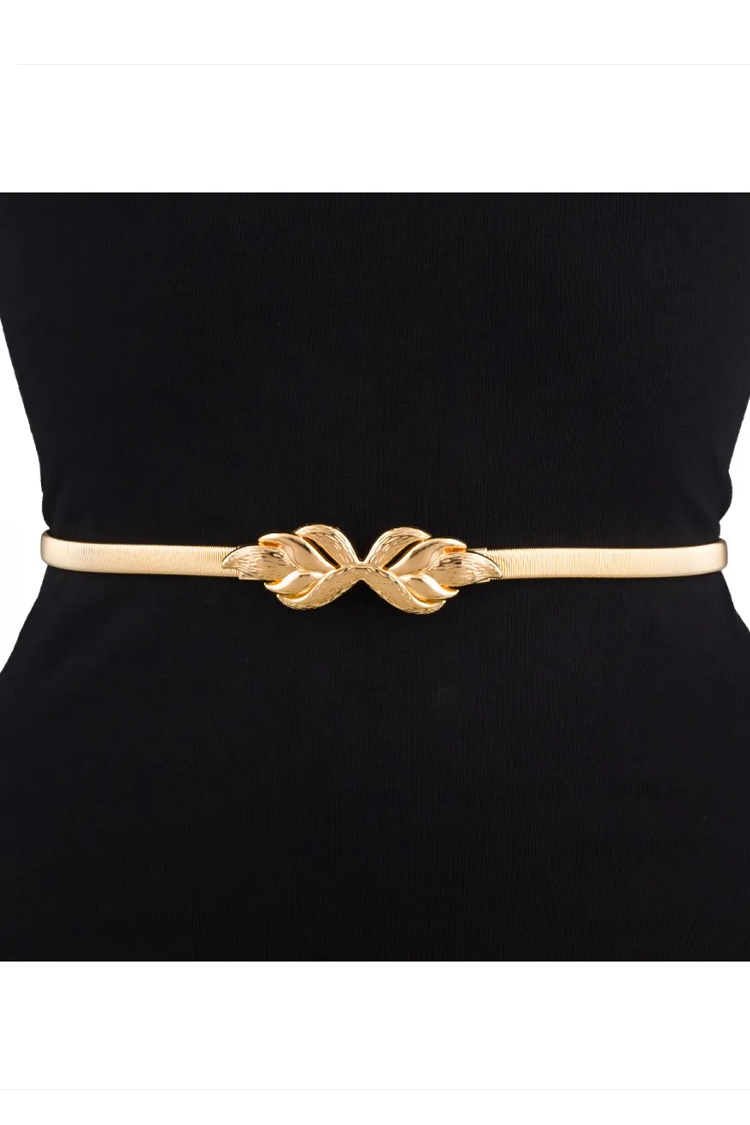 Фината златиста верига е допълнена от ефектна декоративна закопчалка с форма на листа, която привлича вниманието и подчертава талията по стилен начин.